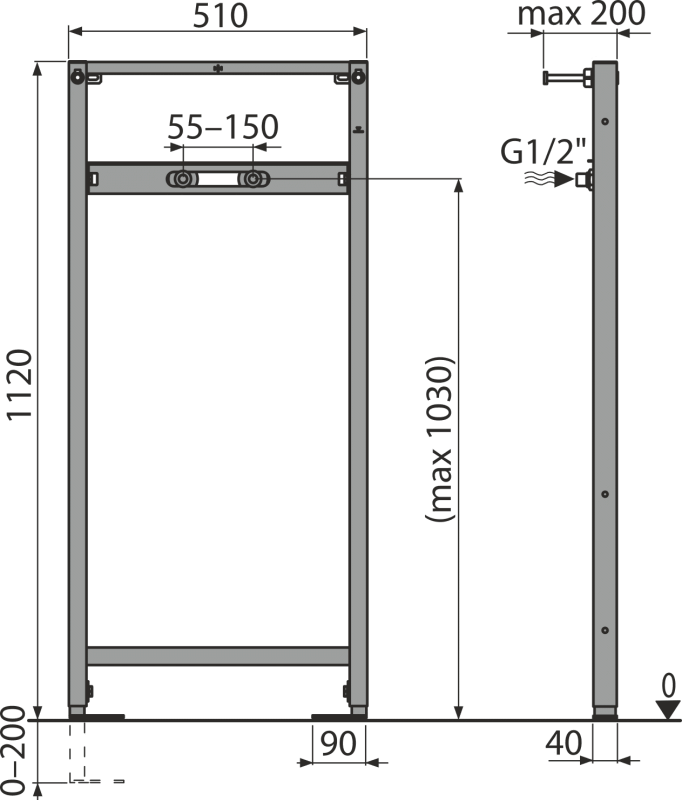 - Bară transversală pivotantă pentru montarea robinetului de perete cu distanță reglabilă 55–150 mm