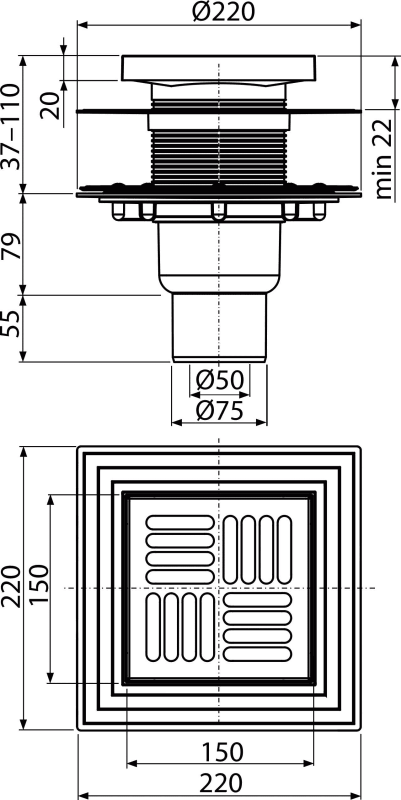 | APV0400 | Drain throat, grid 150×150 mm steel |