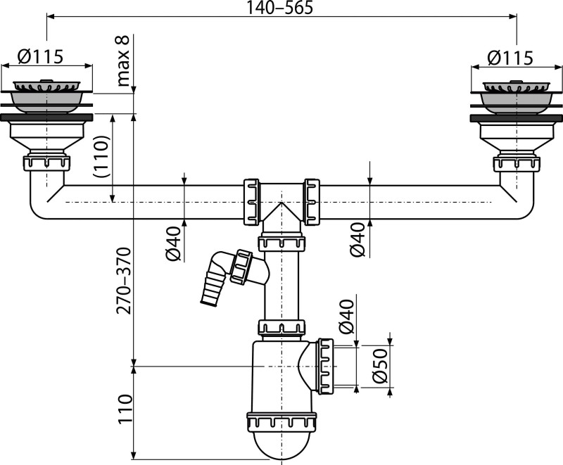 Sifon chiuvetă dublu cu sită din oţel inoxidabil DN115 şi legătură maşina de spălat