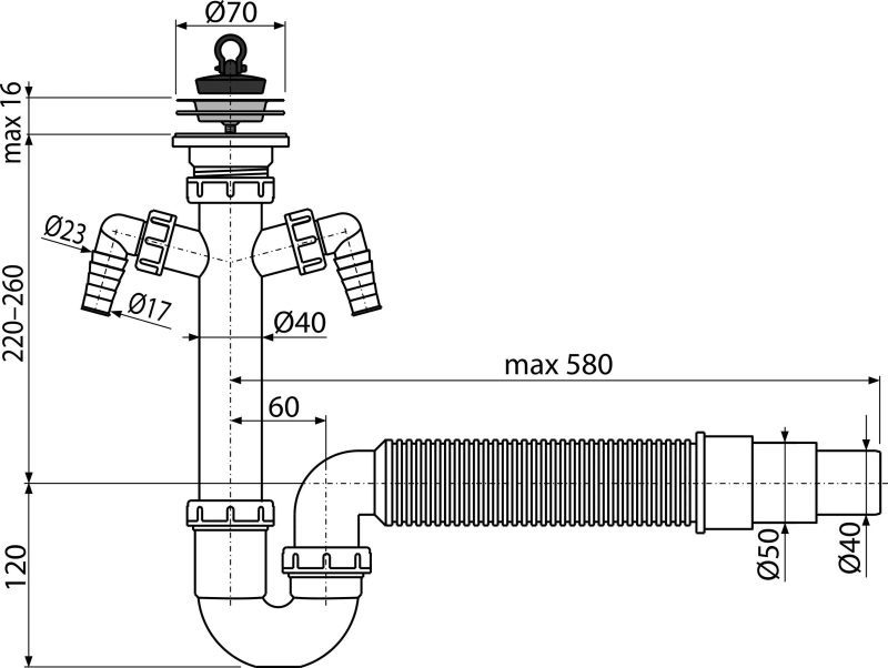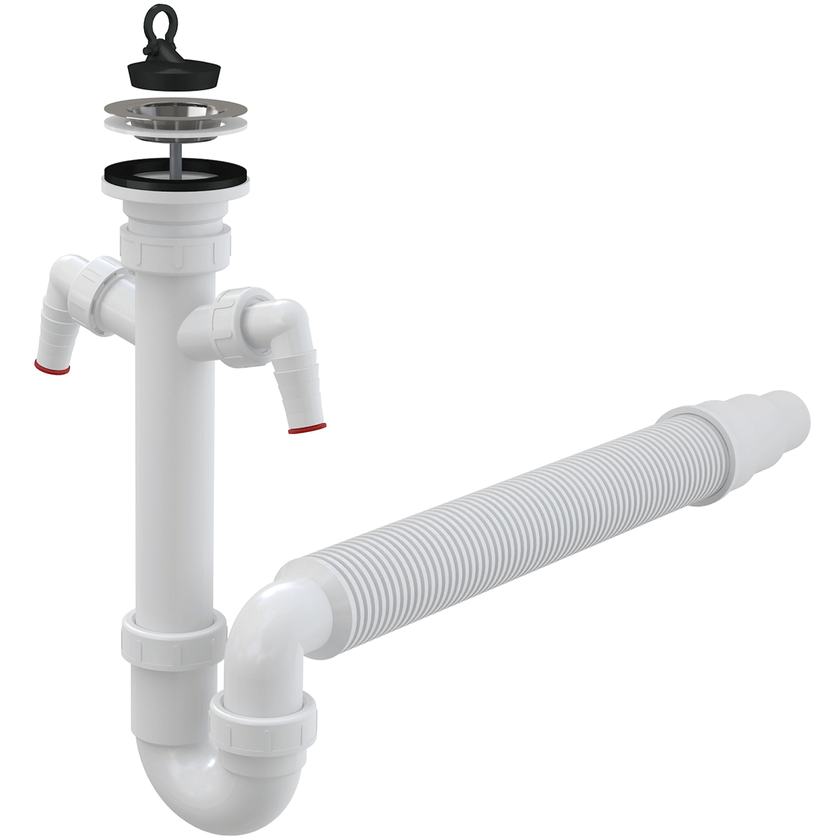 Sifon chiuvetă cu ţeavă, sită din oţel inoxidabil DN70, 2 legături maşina de spălat şi evacuare flexibilă