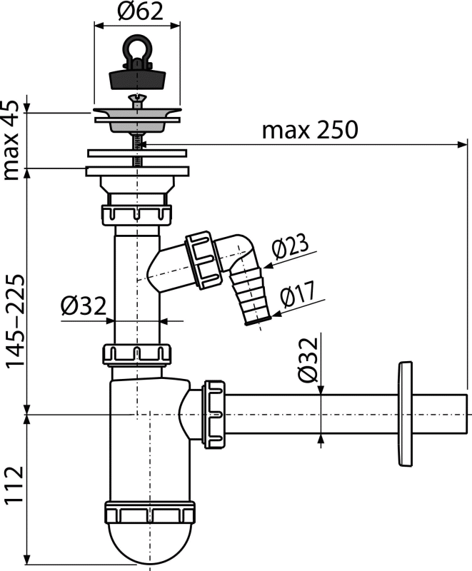 Sifon lavoar DN32 cu sită din oţel inoxidabil DN63 şi legătură la maşina de spălat