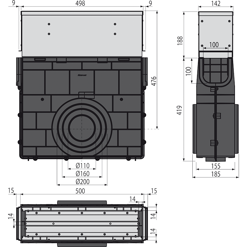 - Conectare laterală la evacuare – DN110/160, 200 mm