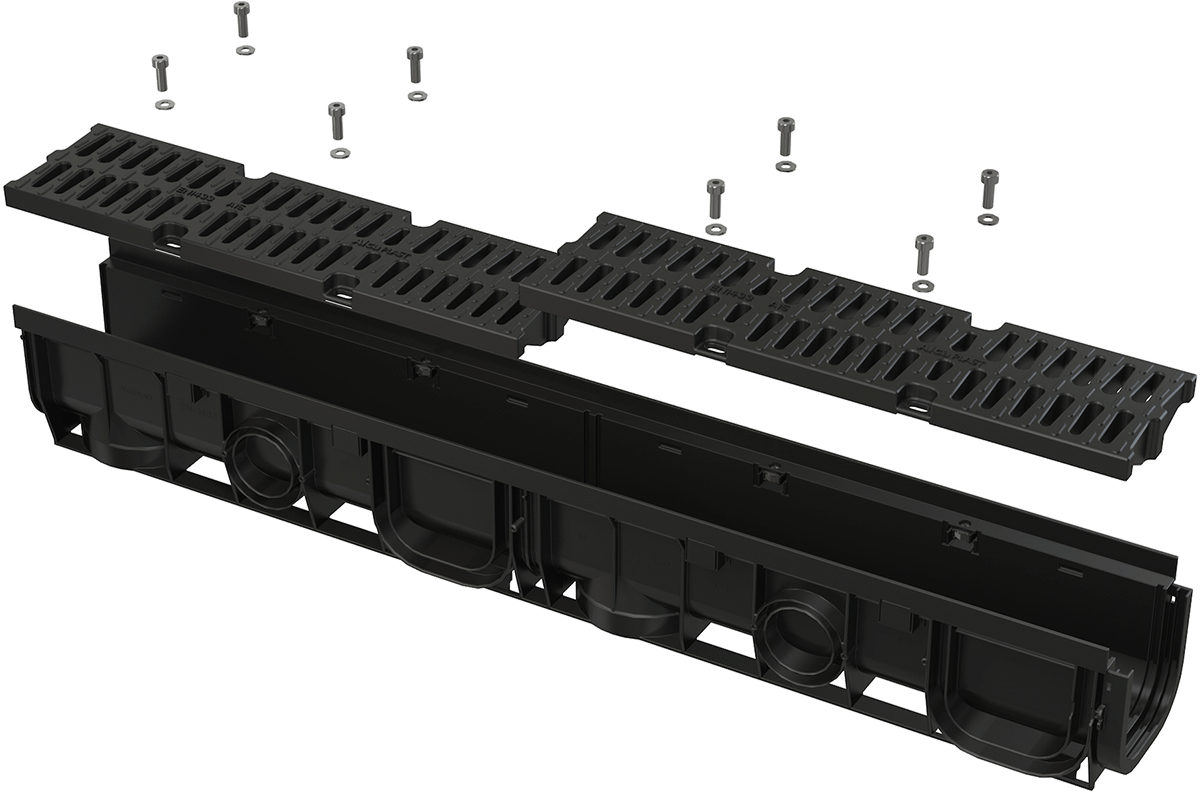 - Grătar din plastic – fixat la canalul de scurgere cu opt șuruburi din oțel inoxidabil, perforații 14 mm
